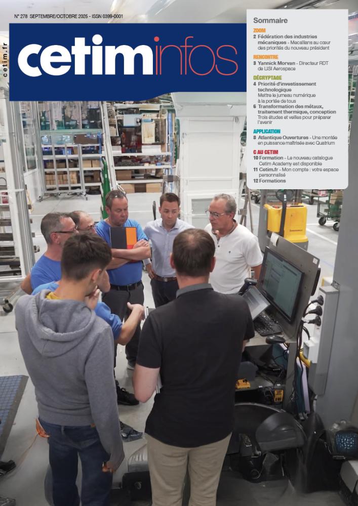 Magazine phare du Cetim, Cetim Infos est le lien privilégié avec les entreprises mécaniciennes. Il a pour vocation de transmettre les informations les plus pertinentes pour soutenir la « cause industrielle ». Sous différentes rubriques, tous les projets, actions, résultats, etc., permettent au lecteur d’être au cœur de l’actualité technique et culturelle de la vie mécanicienne.