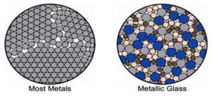 Un alliage métallique amorphe, appelé aussi « verre métallique » (de l’anglais : Bulk Metallic Glasses – BMG) , est un alliage intermétallique solide doté d’une structure amorphe (désordonnée) plutôt que cristalline. Ces matériaux peuvent être obtenus par refroidissement très rapide depuis l’état fondu de l’alliage, ou par d’autres méthodes. La combinaison d’un état métallique et d’une structure amorphe, confère à ce type de matériau une association unique de propriétés mécaniques, électriques, magnétiques et de résistance à la corrosion avec une possibilité de mise en forme directe depuis l’état liquide. Ces alliages sont en général de type 80 % de métaux et 20 % de métalloïdes ou 50 % de métaux « ordinaires » et 50 % de métaux nobles ...