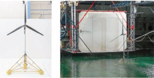 c. Architecture globale du système Les éoliennes « Offshore » flottantes offrent plus de possibilités de positionnements géographiques mais possèdent un certain nombre de contraintes. L’éolienne sera alors soumise à des mouvements de balancier qui peuvent avoir des influences sur les sollicitations au niveau de la turbine et des pales. La conception du système utilisé repose sur l’utilisation d’une structure de type TLP (« Tension Leg Platform »). C’est une plate-forme ancrée par des lignes d’ancrage tendues au fond marin. Le flotteur est composé de bouées et de bracons garantissant une structure rigide et légère. Enfin, l’éolienne est composée d’un mât, d’une turbine et de pales.