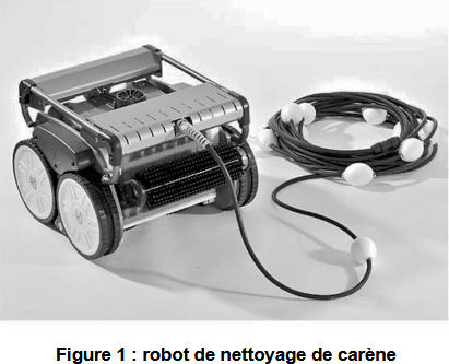 La société H est née de ce constat et a créé le premier robot sous-marin (Figure 1) permettant le nettoyage à flot des coques de bateaux à voile ou à moteur, quelles que soient leur dimension et leur configuration. Destiné aux professionnels de la plaisance, le robot de carène permet l’entretien régulier des coques à matrices dures ou semi-dures des bateaux de plaisance. Il permet de détacher les impuretés par une action mécanique de brossage assurée par des brosses rotatives.