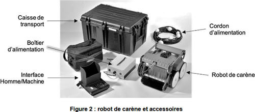 Pour que l’entretien de la coque du bateau puisse se faire à partir du quai ou du pont, le robot a été conçu pour être facile à transporter, à mettre en œuvre et à utiliser. Une interface Homme-Machine permet de le piloter et il est alimenté grâce à un cordon et un boîtier d’alimentation (Figure 2).