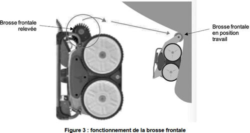 Le déplacement du robot est assuré par quatre roues entraînées par une courroie. Le brossage est réalisé par une brosse frontale et deux brosses ventrales souples qui doivent assurer un nettoyage efficace sans détériorer la coque ou le revêtement antifouling (Figure 4).