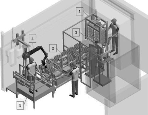 - Manipulateur (4) : système d'assistance à la manutention des plaques. Le manipulateur assure une assistance à la manutention des plaques pleines en bout de transfert aussi bien lors de la prise des plaques, que lors de leur dépose sur la table élévatrice mobile. Une fois chargée, la table élévatrice emmène les plaques vers le poste de cuisson.
