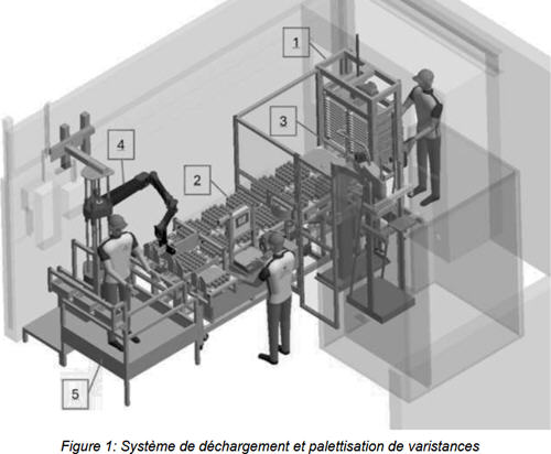 Ces varistances, composants électroniques utilisés pour protéger les circuits contre les surtensions, sont fabriquées à partir d'oxyde de zinc (ZnO) compacté puis fritté. La ligne de production étudiée s'installe entre la sortie de la presse et les fours de frittage. Elle doit permettre d'augmenter la productivité tout en limitant les risques de troubles musculosquelettiques.