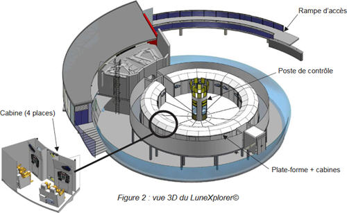 La mission LuneXplorer© propose une simulation immersive d'une mission lunaire complète, du décollage orbital à l'alunissage. Ce parcours expérientiel, d'une durée d'environ 30 minutes, met en scène 40 « astronautes » répartis en dix capsules (cabines) distinctes. Les passagers sont soumis à des accélérations centrifuges simulées, atteignant jusqu'à 3 g, reproduisant fidèlement les sensations éprouvées lors d'un véritable lancement spatial.
