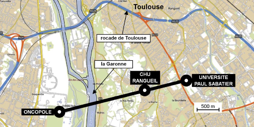 Le projet d’un téléphérique urbain, de 3 km, à Toulouse, reliant l’Oncopole à l’Université Paul Sabatier et passant par le CHU de Rangueil, a été inauguré le 13 mai 2022 sous le nom de Téléo.