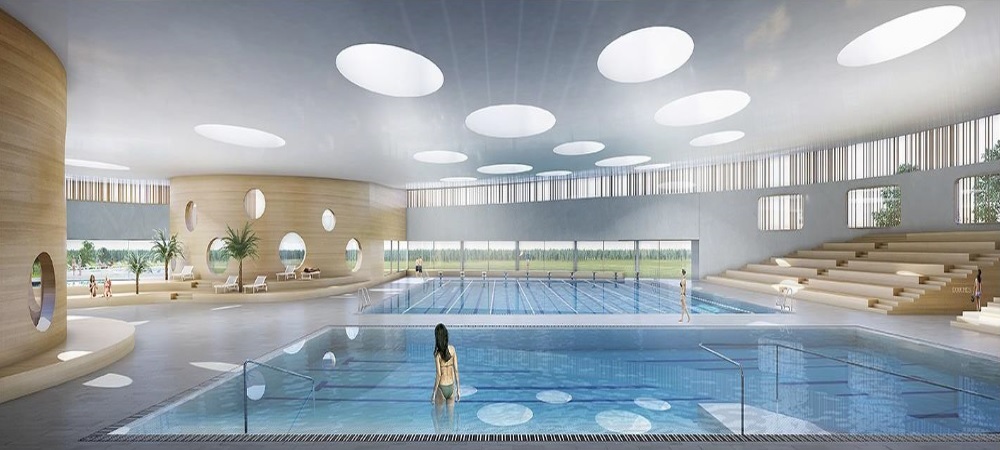 - une première entité couverte abritant des bassins sportifs et d’apprentissage, des plages et des vestiaires,