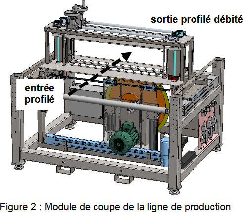 Le fonctionnement général (figure 1) peut se résumer ainsi : le renfort (tissu, mat, fibres) conditionné en bobine et imprégné de résine thermodurcissable ou de polymère thermoplastique est tiré à travers une filière chauffée qui contrôle la teneur en résine ou polymère et détermine la forme de la section. Le passage dans ce four va ainsi provoquer la polymérisation de la résine ou la fusion du polymère et donner la forme finale. Le produit est ensuite coupé à la longueur souhaitée. Le sujet porte sur le module de coupe d’une ligne de production (figure 2) conçue et exploitée par une société française permettant l’obtention de profilés à base de fibre de carbone ou fibre de verre par pultrusion.