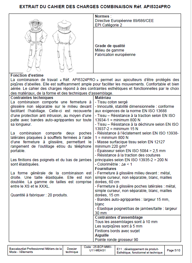 Ce projet a été confié à la modéliste du bureau d’études de l’entreprise. Les contraintes techniques de ce produit sont classées en catégorie EPI 2, et doivent respecter les normes de santé et de sécurité établies par la directive européenne 89/686/CEE.