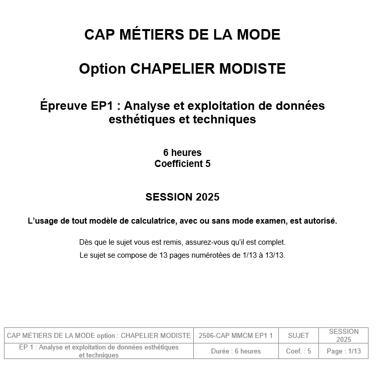 Le directeur commercial du musée fait appel à votre savoir-faire de chapelier-modiste afin de réaliser un modèle de chapeau (qui sera vendu en plusieurs exemplaires) pour la boutique du musée.