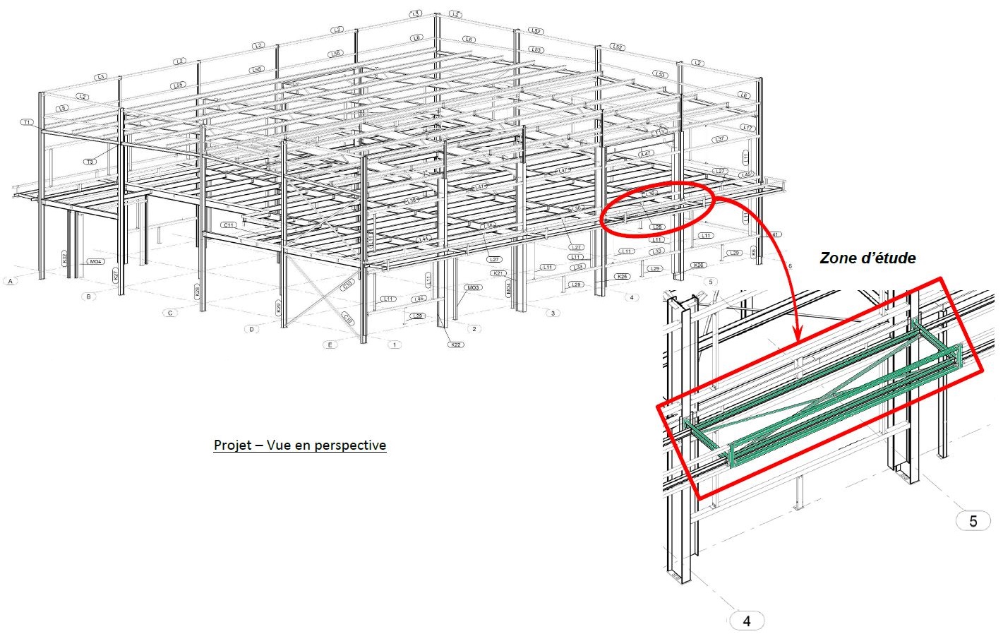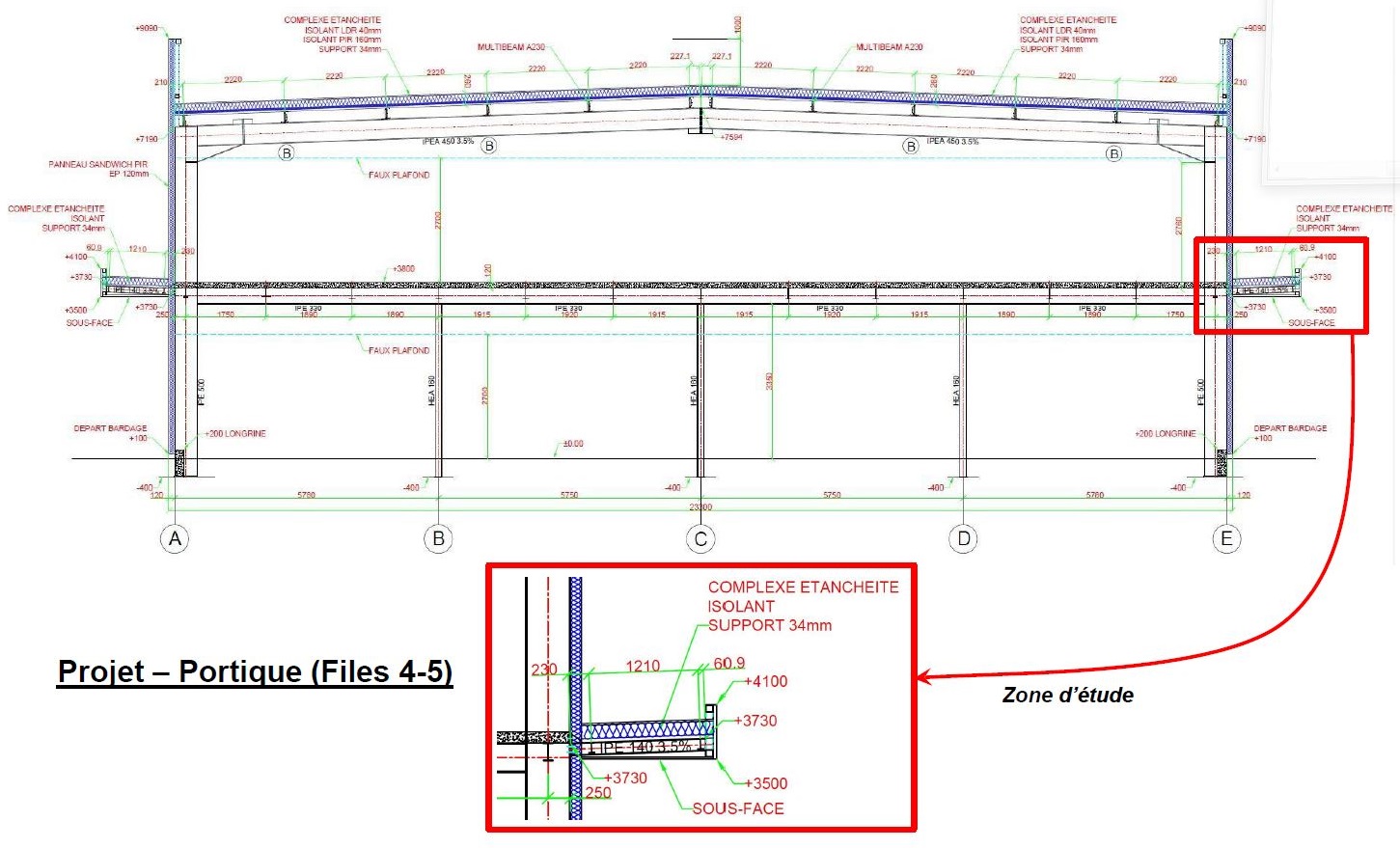 Le projet concerne l’extension d’un bâtiment à usage commercial constitué de 6 portiques en profilés laminés type IPE, de la file 1 à 6, et d’un plancher des files A à E avec poteaux intermédiaires.