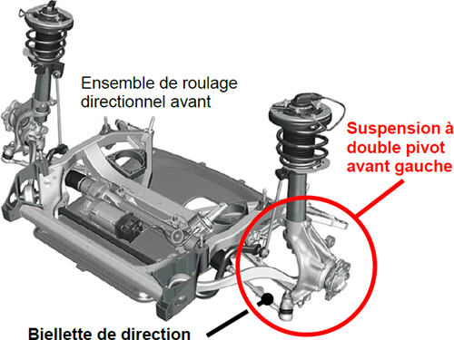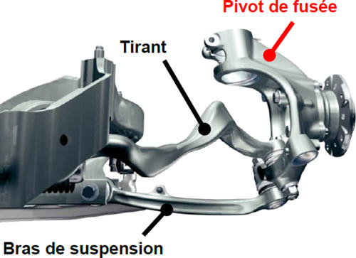 Le classique triangle de suspension inférieur est remplacé par deux éléments spécifiques : le bras de suspension situé à l’arrière et le tirant de forme particulière pour permettre le passage de la biellette de direction (non représentée sur la vue ci-dessous).