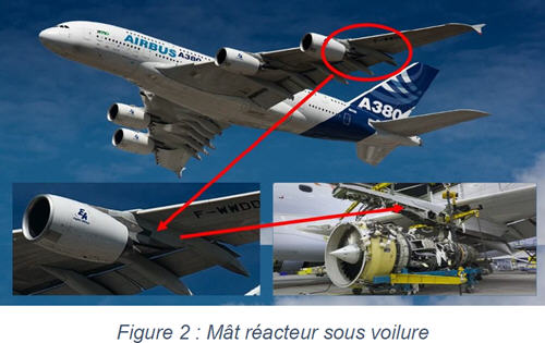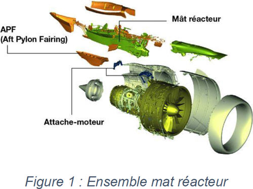 Le mât réacteur, appelé également pylône (pylon en anglais), est la pièce maîtresse de la structure de l’avion qui sert à fixer les réacteurs sous la voilure de l’avion (Figure 2). Le mât de réacteur est fixé à la voilure de l’aéronef qui soutient le réacteur pour transmettre les charges et la puissance des réacteurs à l’avion. Le mât assure deux principales fonctions :