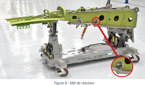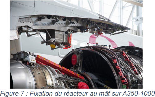 La structure du mât-réacteur est fixée aux longerons avant et principal pour répartir la charge créée par les réacteurs sur l'aile. Lorsque les réacteurs dépassent les longerons avant, leurs masses produisent un moment de torsion vers le bas. Léger et résistant à des températures allant de - 50° à + 600° C, c’est en titane que cette partie de l’appareil est fabriquée. Monté sous chaque aile ou sur le fuselage (Figure 6 et Figure 7) son rôle est :