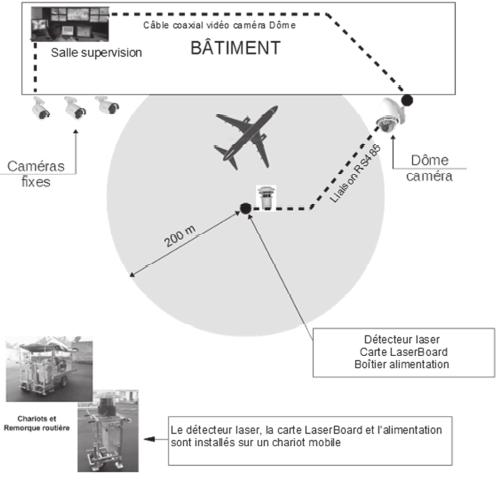 L'objet étudié est un système de vidéo-surveillance d'un avion sur un aéroport. Un détecteur laser (ALS) balaie la zone à surveiller et compare le signal réfléchi avec une référence. Lorsqu’une différence est détectée, le dispositif LaserBoard envoie les coordonnées de la cible à une caméra dôme PTZ (Pan Tilt Zoom) située sur le toit du bâtiment de supervision. La caméra transmet l'image de l'intrus à un PC situé dans la salle de supervision.
