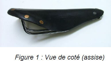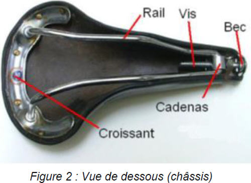 Une selle de bicyclette en cuir est composée d’une assise en cuir (Figure 1) et d’un châssis (Figure 2). Ces deux parties sont assemblées par un rivetage qui apparaît en surface du cuir sur l'arrière de la selle.