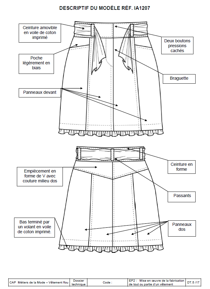 En collaboration avec la styliste de l'entreprise, la modéliste demande de concevoir le prototype du modèle Réf. IA1207 en toile 100 % lin. La jupe est agrementée d'une ceinture et d'un volant en voile de coton imprimé. Le prototype doit être réalisé en respectant rigoureusement les normes de sécurité et d'ergonomie, les délais impartis ainsi que les critères du grade de qualité.