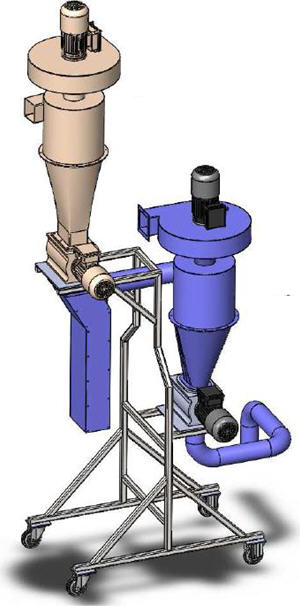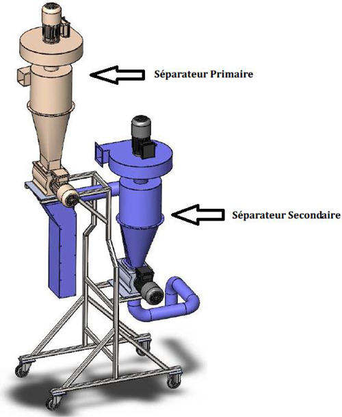 Descriptif du module ZIGZAG : Le module ZIGZAG permet de limiter le tri en amont et de traiter simultanément les câbles souples et rigides. Ce système permet d’éliminer la fraction légère de la matière broyée (poussière, peinture, etc...). La séparation en général s’en trouve optimisée et la production augmentée. Le système ZIGZAG est un séparateur à air conçu pour enlever la partie légère des déchets traités grâce à un flux d’air dans un conduit. Durant ce processus, un flux d’air en contre-courant permet l’aspiration des matériaux légers durant la chute. Le séparateur ZIGZAG est normalement installé après le broyage fin pour améliorer la qualité du granulat. Idéal pour le nettoyage de résidus du broyage et pour séparer la partie lourde du cuivre et de l’aluminium après le broyage des câbles, et ainsi séparer, toutes les parties légères des parties lourdes.