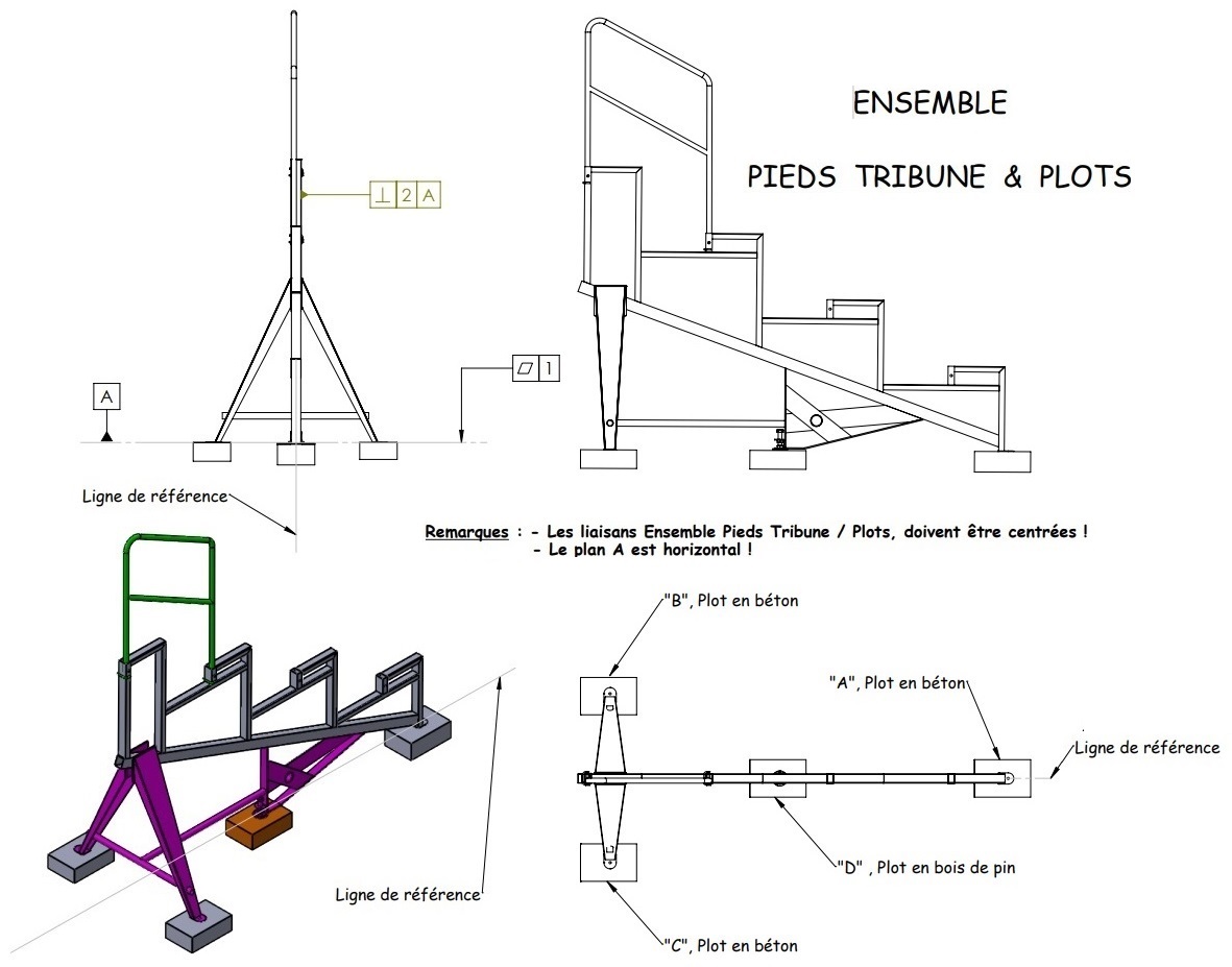 Vous devez réaliser la pose d’un pied de tribune en conformité avec le plan d’implantation sur plots en béton de différentes épaisseurs :