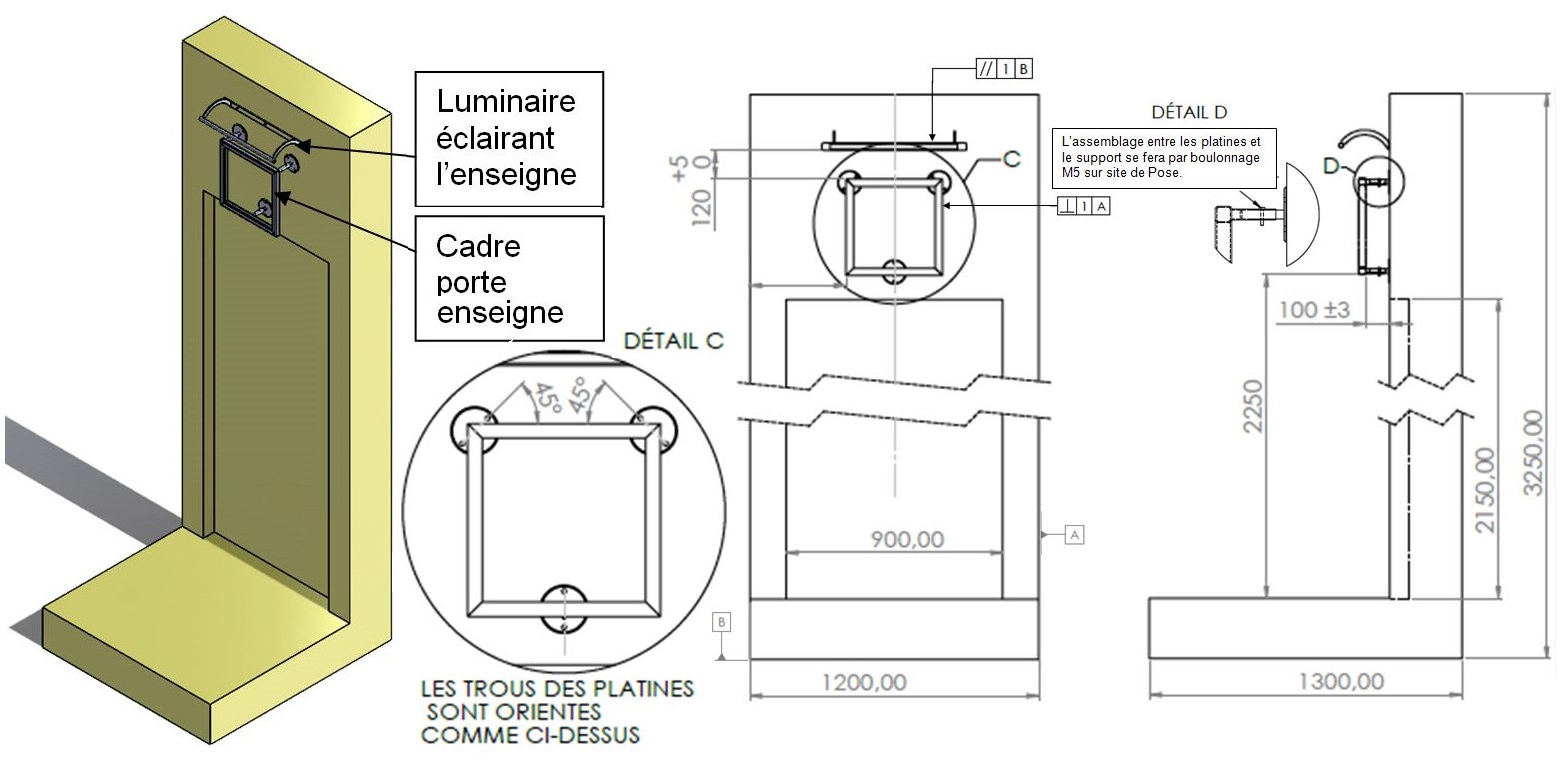 Le maître d’œuvre a décidé d’installer des plaques portant le nom des bâtiments. Après accord et modélisation de l’architecte, un projet a été proposé. Vous êtes chargé d’installer le cadre porte nom (enseigne) et le luminaire éclairant . Vous devez :
