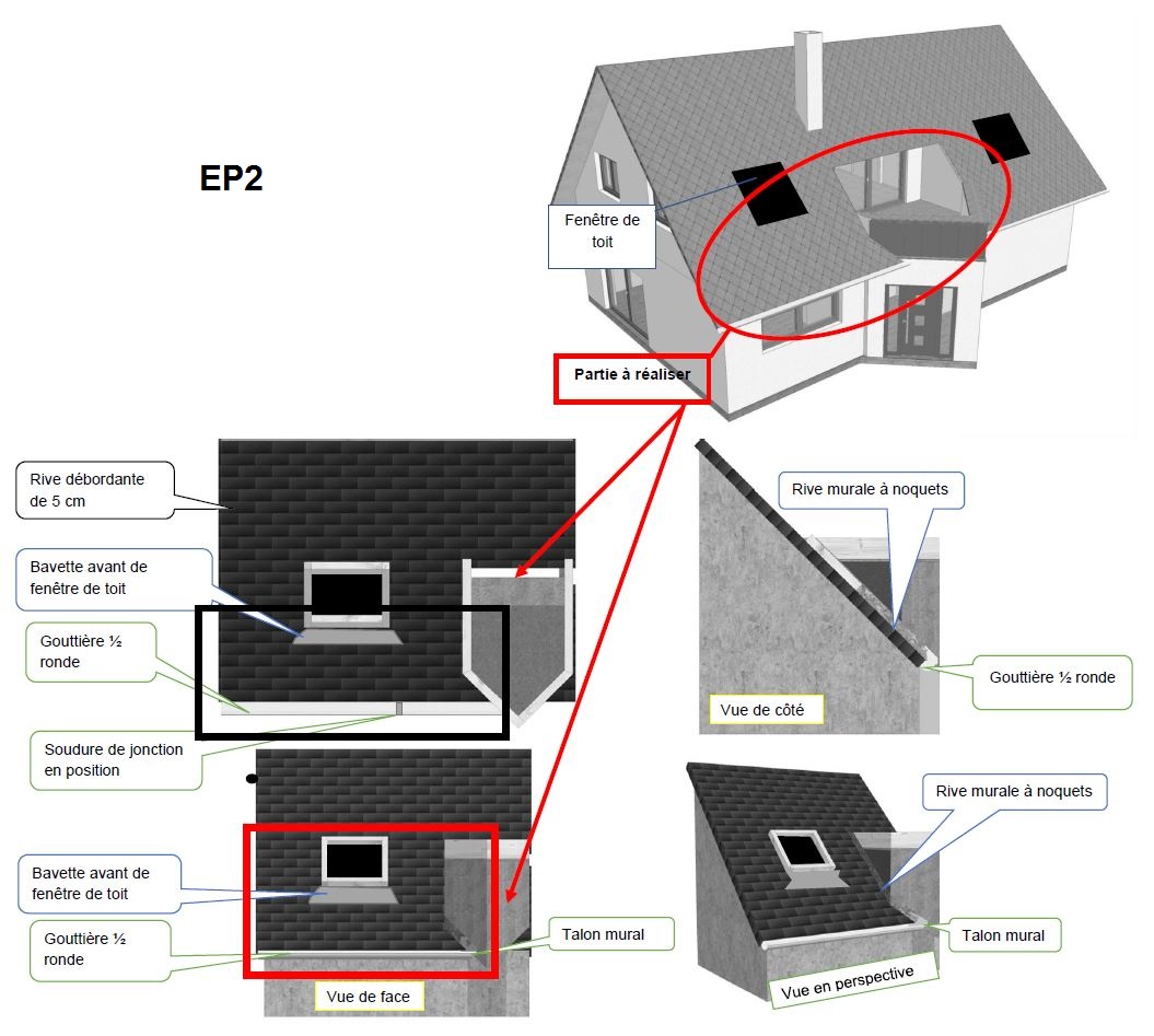 Lors de votre arrivée sur le chantier, on vous demande de réaliser les évacuations d’eaux pluviales, le raccordement avec le mur de la terrasse, la rive débordante et le passage de la chatière de ventilation.