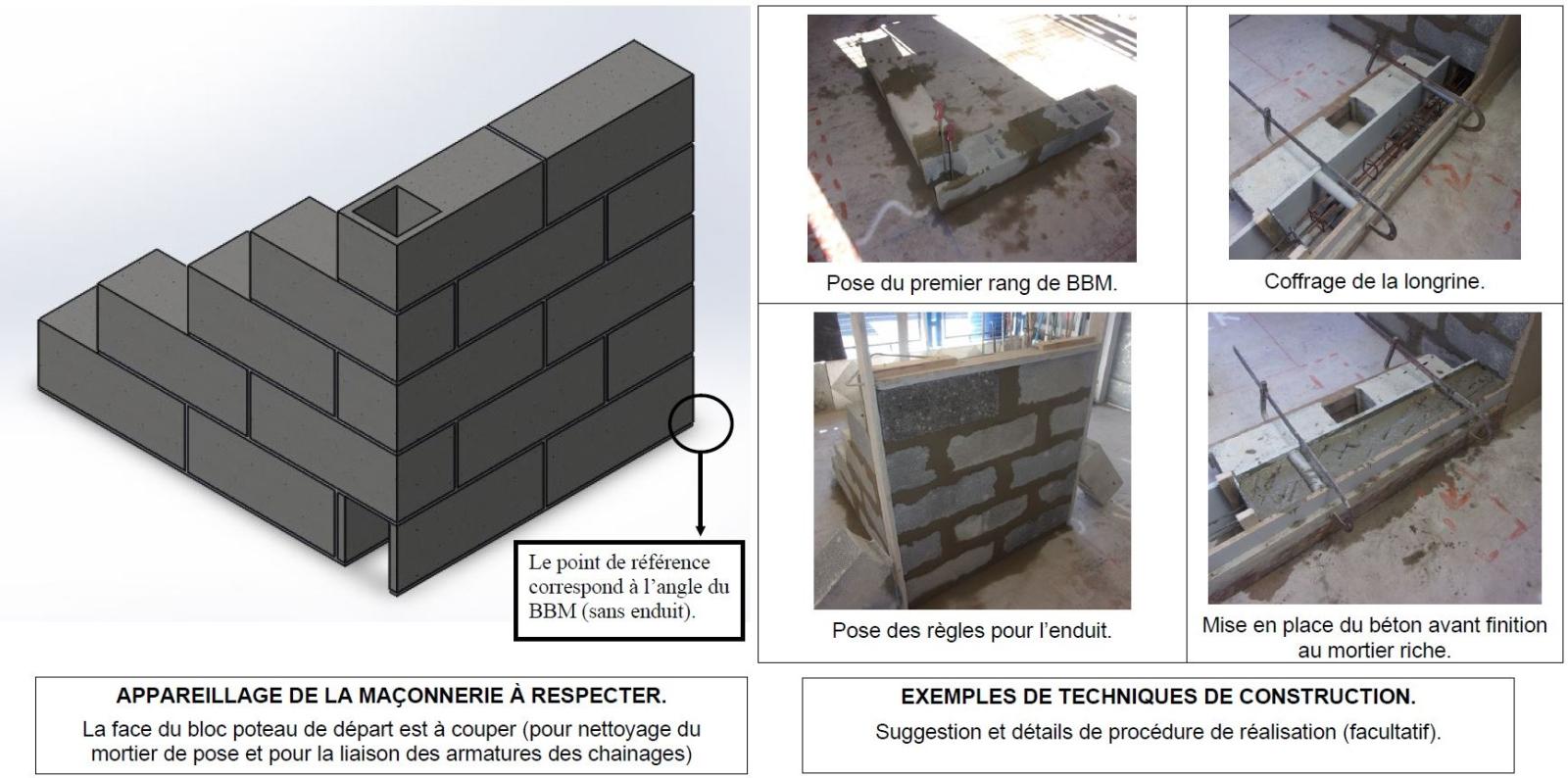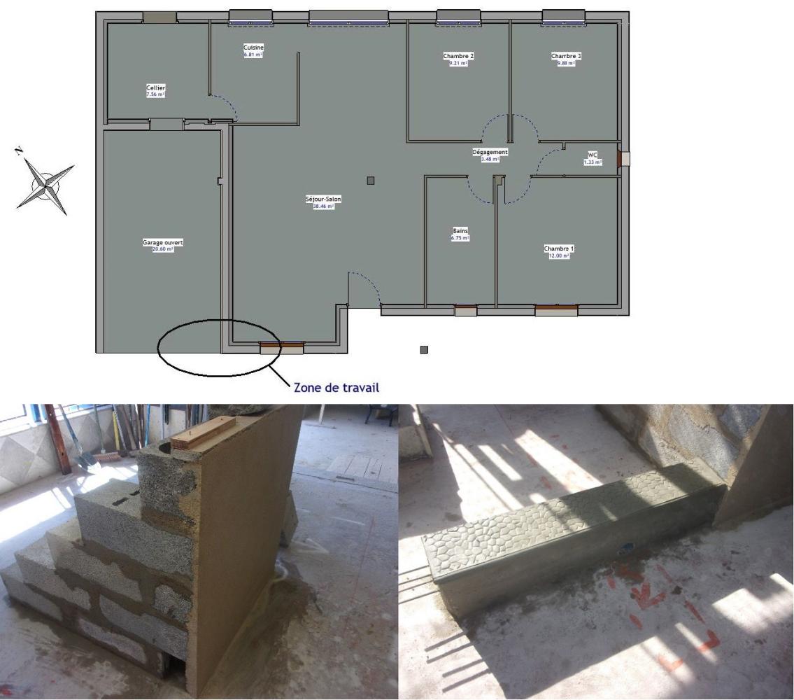 Votre chef d’équipe vous confie la réalisation d’une partie d’un mur extérieur en BBM et d’une longrine / seuil de la façade sud-Ouest. Il vous demande de vérifier les fournitures nécessaires avant de procéder à la réalisation de l’ouvrage. Puis, de réaliser la pose des blocs béton, de confectionner la longrine en béton armé et d’appliquer l’enduit monocouche (en conformité du cahier des charges).