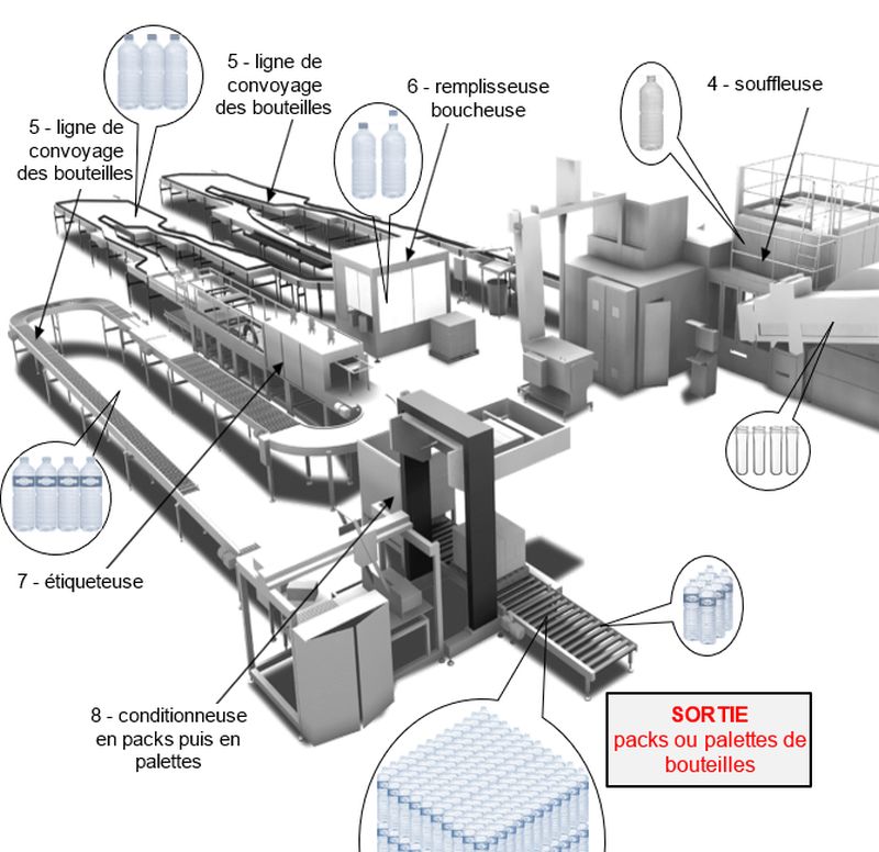 L’objet de l’étude porte sur une ligne de conditionnement de bouteilles d’eau en plastique. Cette ligne de fabrication de bouteilles plastiques produit actuellement 320 millions de bouteilles par an et fonctionne en moyenne 8 000 heures par an.