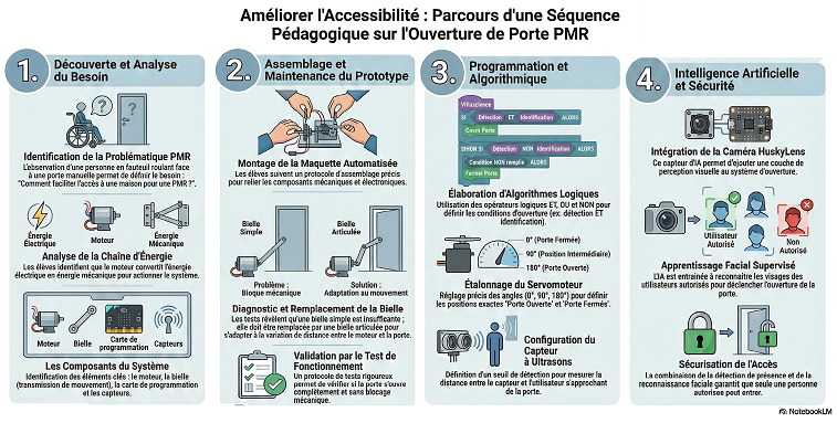 Lors de cette séquence, les élèves seront amenés à se questionner sur plusieurs thèmes clés : 1. Comment faciliter l’accès à une maison pour une personne à mobilité réduite ? 2. Comment assembler le prototype du système d'une porte à ouverture automatique ? 3. Comment programmer l’ouverture automatique de la porte ?