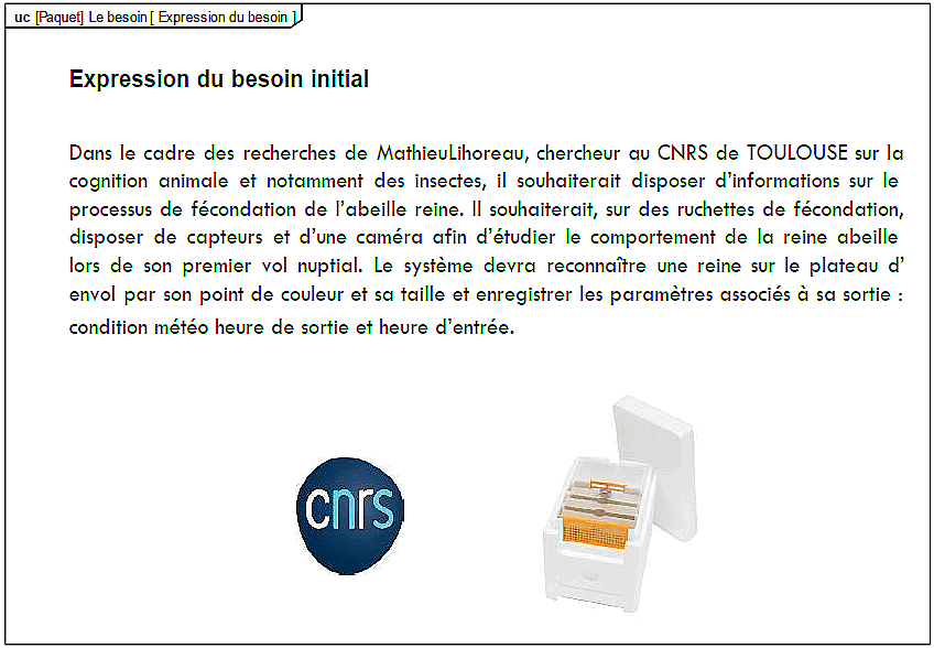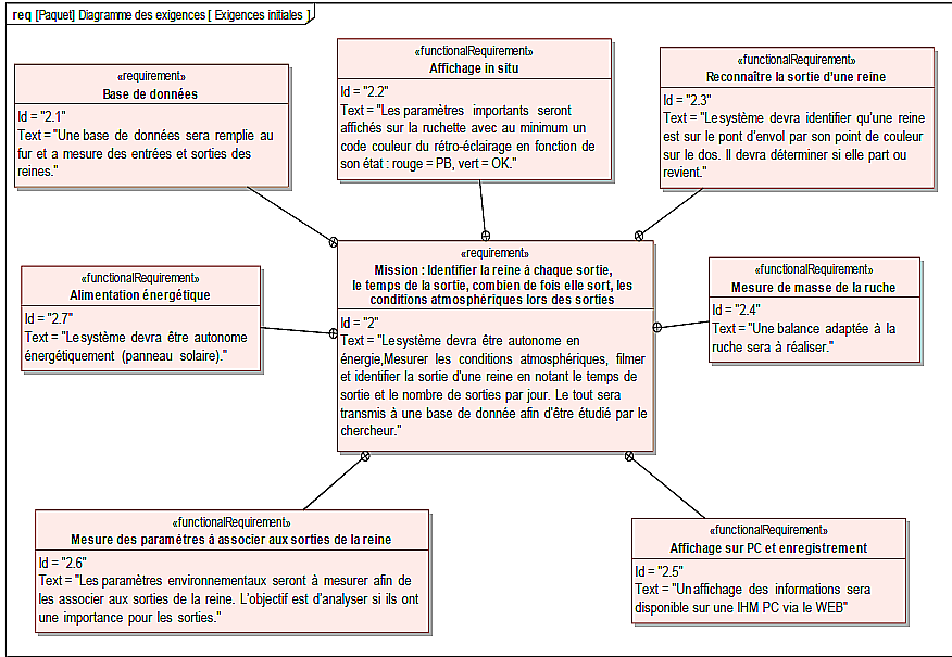 Projet_Ruchette.mdzip (au format Magic draw) Projet_Ruchette_post_appropriation (au format Word). Diagramme des exigences affinées avec répartition des éléves. sti2d_SIN_Ruchette_Fiche_compétences