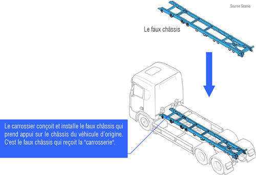 1. Fonctions du châssis 2. Les véhicules utilitaires légers (VUL) 3. Les véhicules industriels (VI) 4. La structure du châssis 4.1. Déformation du châssis dans les virages 4.2. Impact des organes suspendus 4.3. Fixation des traverses sur les longerons 5. Le faux châssis 5.1. Principe de fixation du faux châssis 5.2. Analogie avec 2 planches 5.3. Exemple de préconisations Scania 5.4. Exemple préconisations Renault 5.5. La forme du faux châssis 5.6. Dimensions minimales du longeron du faux châssis 5.7. Forme des sections des longerons et traverses des faux châssis 5.8. Traverses longitudinales de faux châssis 5.9. Vérification de la hauteur Hmini entre le dessus du longeron du CC et le dessous de la carrosserie 5.10. Les pontets dans le commerce 5.11. Le centre de flexion 6. Exemple sur site : benne sur porteur