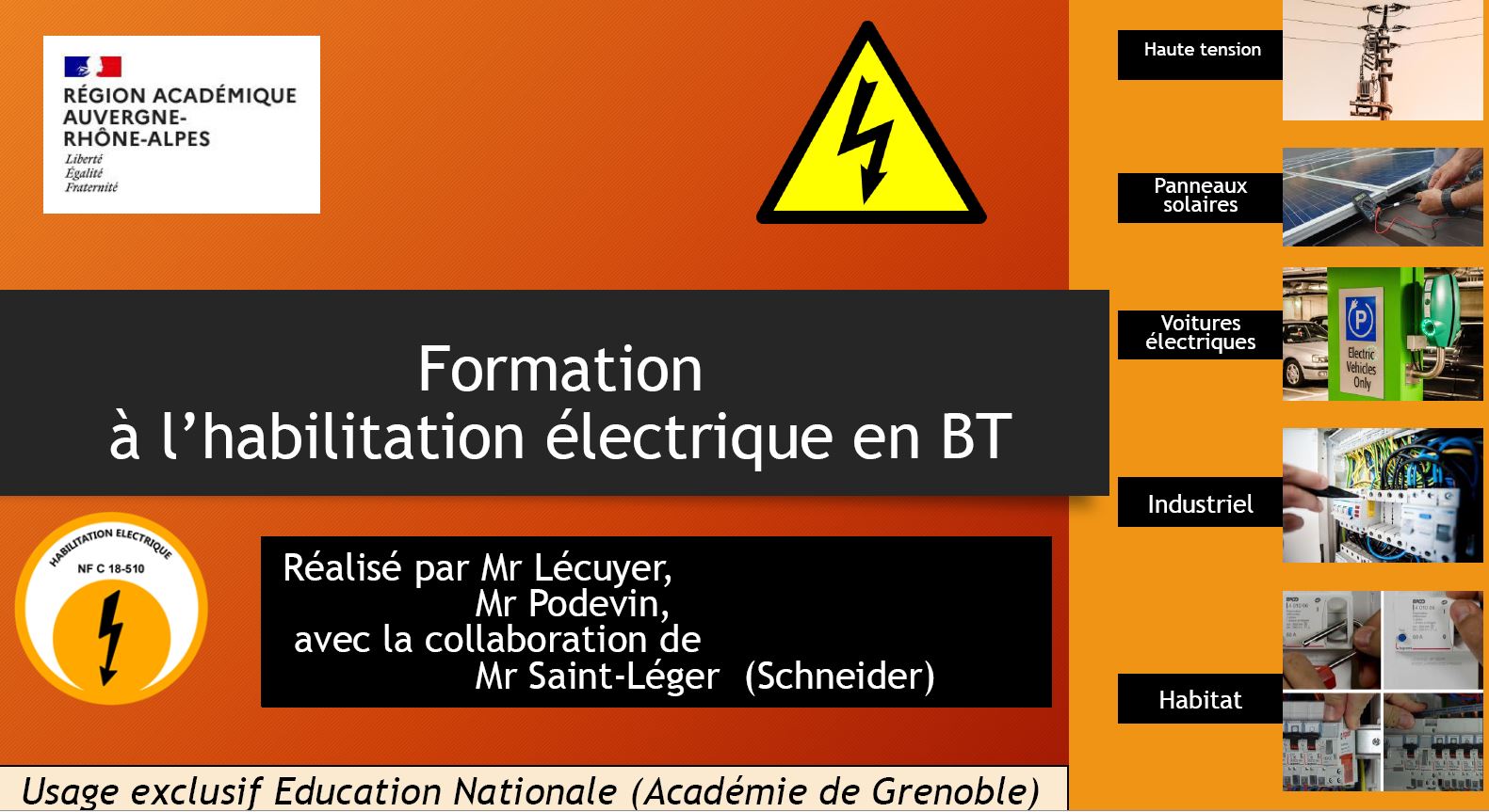 Dans toute formation en électricité, il est indispensable d’aborder les risques électriques ainsi que les habilitations en basse tension. Cette présentation rassemble l’ensemble des notions nécessaires à l’obtention des habilitations en basse tension, pour des niveaux de formation allant du CAP au BTS