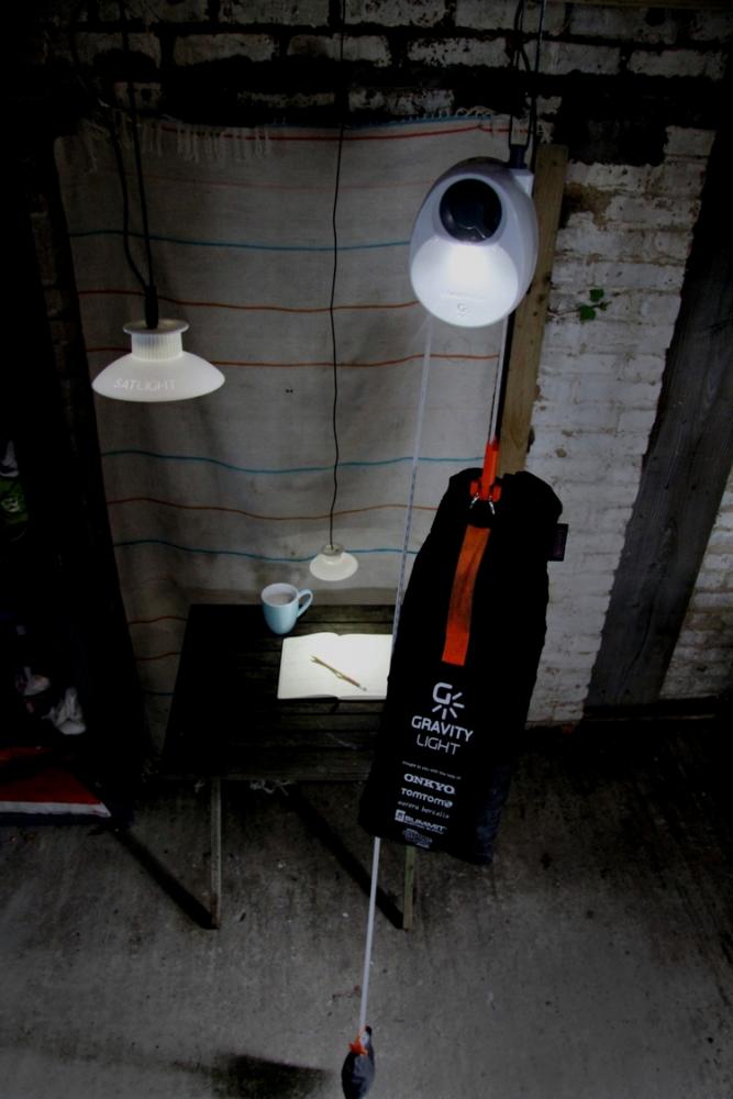 Gravitylight est une lampe à LED, sans batterie, destinée aux pays en développement. Il suffit de remonter manuellement un sac lesté (de pierres, sable ou terre...) qui actionnera une dynamo en descendant sous l'effet de la gravité pour obtenir une demi-heure d'éclairage environ.