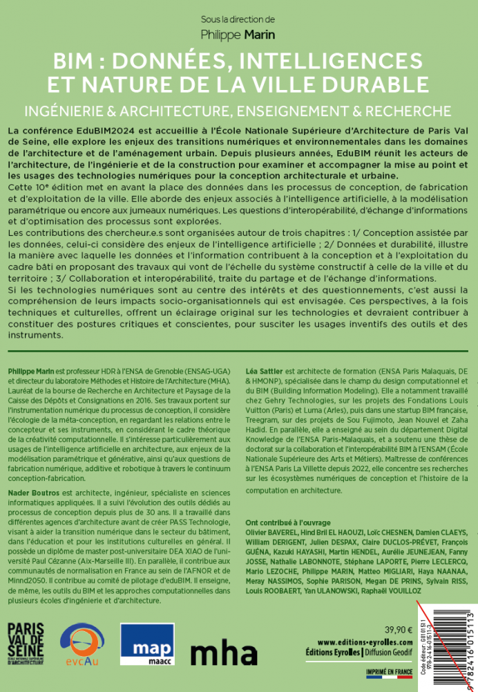 L’environnement bâti et l’aménagement urbain concentrent des enjeux sociétaux qui portent à la fois sur les transitions socio-organisationnelles, technologiques et environnementales. Ces perspectives se comprennent et s’appréhendent aussi bien aux échelles de l’édifice, de la ville que du territoire et de ses infrastructures. Le secteur de l’AECO (Architecture Ingénierie Construction et Opération) rassemble les principaux acteurs de la construction de la ville durable et la rencontre EduBIM explore depuis plusieurs années la manière avec laquelle les technologies numériques participent aux transformations. Cette 10e édition prolonge les réflexions en lien avec le BIM, les enjeux environnementaux et la conception computationnelle, pour considérer la place de la donnée dans les processus de conception, de fabrication et d’exploitation de la ville durable. Il s’agit de regarder comment les processus intègrent ou produisent des données, d’envisager les formes d’intelligence que les processus numériques permettent de constituer et de regarder comment ces techniques prennent place dans un contexte culturel et politique.