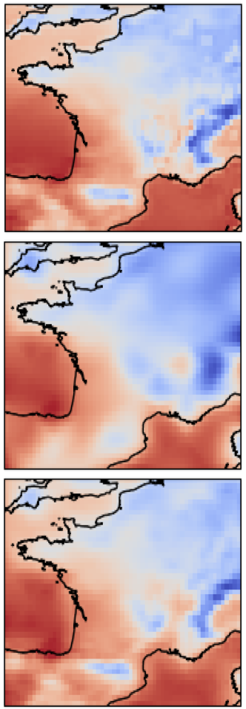 Les modèles météorologiques, telles que les simulations climatiques, fournissent généralement des champs atmosphériques à des résolutions spatiales grossières, de l’ordre de 50 à 100 kilomètres. Bien que suffisante pour décrire les dynamiques à grande échelle, cette résolution ne permet pas de rendre compte des variations locales essentielles à de nombreuses applications : agriculture, hydrologie, prévision météorologique urbaine, ou encore analyse des événements extrêmes. Le downscaling désigne le processus consistant à affiner ces champs grossiers afin d’obtenir une version à plus haute résolution, cohérente à la fois sur le plan statistique et spatial.