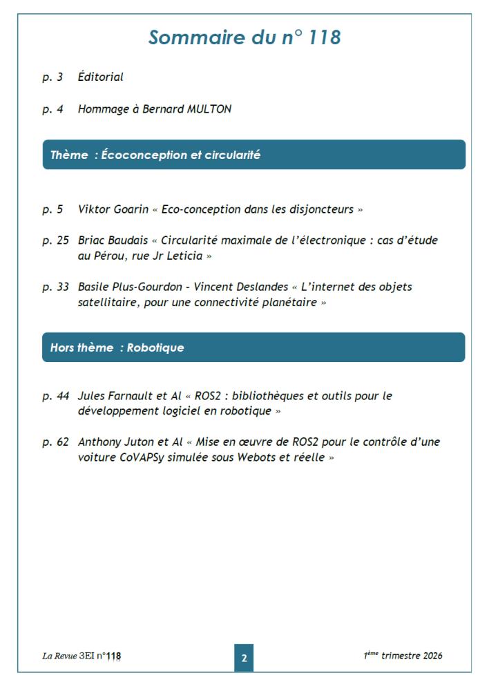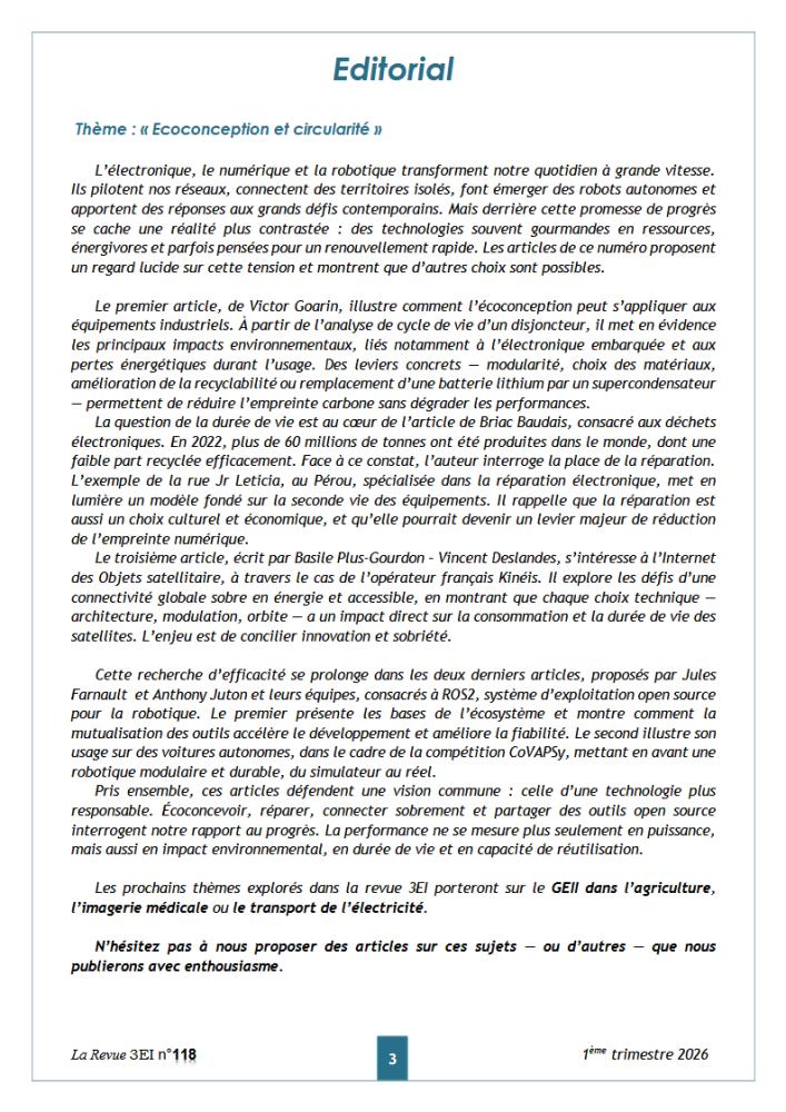 Le troisième article, écrit par Basile Plus-Gourdon – Vincent Deslandes, s’intéresse à l’Internet des Objets satellitaire, à travers le cas de l’opérateur français Kinéis. Il explore les défis d’une connectivité globale sobre en énergie et accessible, en montrant que chaque choix technique - architecture, modulation, orbite - a un impact direct sur la consommation et la durée de vie des satellites. L’enjeu est de concilier innovation et sobriété. Cette recherche d’efficacité se prolonge dans les deux derniers articles, proposés par Jules Farnault et Anthony Juton et leurs équipes, consacrés à ROS2, système d’exploitation open source pour la robotique. Le premier présente les bases de l’écosystème et montre comment la mutualisation des outils accélère le développement et améliore la fiabilité. Le second illustre son usage sur des voitures autonomes, dans le cadre de la compétition CoVAPSy, mettant en avant une robotique modulaire et durable, du simulateur au réel.