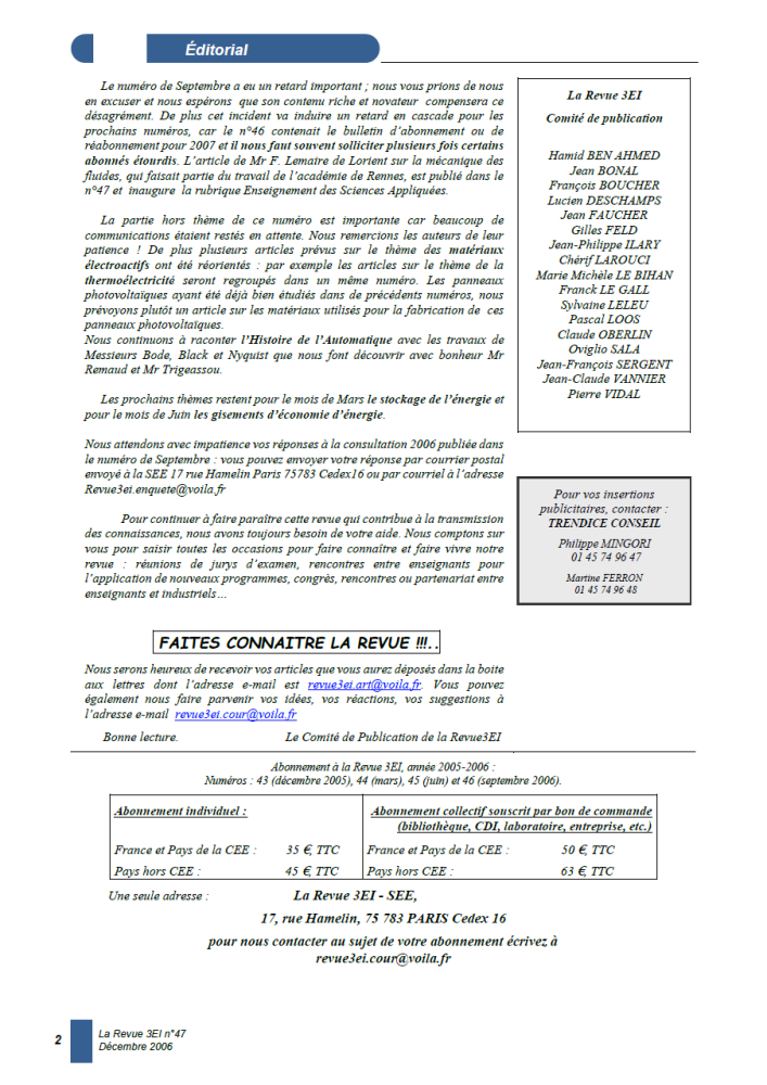Le numéro de Septembre a eu un retard important ; nous vous prions de nous en excuser et nous espérons que son contenu riche et novateur compensera ce désagrément. De plus cet incident va induire un retard en cascade pour les prochains numéros, car le n°46 contenait le bulletin d’abonnement ou de réabonnement pour 2007 et il nous faut souvent solliciter plusieurs fois certains abonnés étourdis. L’article de Mr F. Lemaire de Lorient sur la mécanique des fluides, qui faisait partie du travail de l’académie de Rennes, est publié dans le n°47 et inaugure la rubrique Enseignement des Sciences Appliquées.