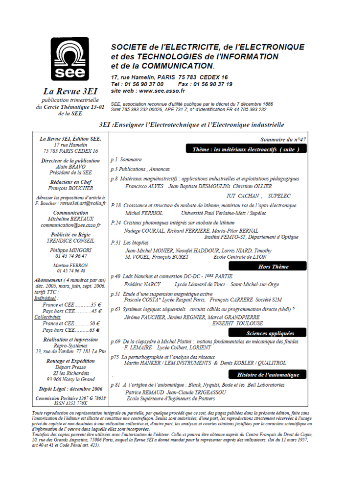 Lire les articles : La Revue 3EI - N°47 - décembre 2006 : Les matériaux électroactifs