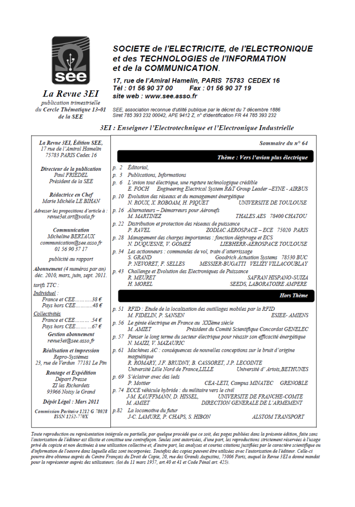 Cette ressource propose les articles : CEM : contrainte majeure dans équipements embarqués, Condensé CEM appliqué électronique puissance, Filtrage émissions conduites, Historique CEM et Présentation Moyen d’essai en Immunité, Analyse tensorielle des réseaux appliquée à la CEM électronique puissance, Réseaux énergie électrique dans navires surface, ESME Sudria partenaire du CONCORDAT GENELEC 2010, Conversion énergie par effets thermoélectriques, Convertisseurs Statiques : Percées dans applications – Révolution architectures, Enjeux composants puissance SiC, Synthèse films diamant applications électronique puissance, Nanostructuration carbones activés et supercondensateurs carbone/carbone haute densité énergie