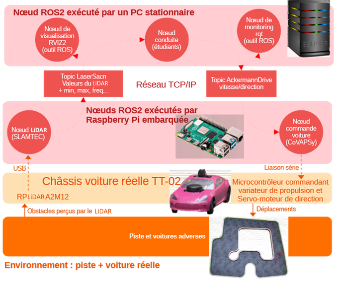 Cette ressource présente ROS et ses différents composants et guide le lecteur à travers la documentation de la version ROS2 pour sa mise en œuvre sur deux premiers exemples. Elle est suivie de la ressource Mise en œuvre de ROS2 pour le contrôle d’une voiture autonome simulée sous Webots et réelle (publication proche) présentant la mise en œuvre de ROS2 réelle et simulée.